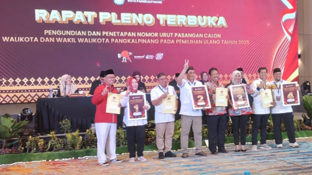 PANGKALPINANG, DAN – Komisi Pemilihan Umum (KPU) Kota Pangkalpinang resmi menetapkan nomor urut empat pasangan calon Wali Kota dan Wakil Wali Kota Pangkalpinang dalam Pemilihan Wali Kota Ulang (Pilwako Ulang) 2025. Penetapan berlangsung di Hotel Aston Pangkalpinang pada Rabu malam, 23 Juli 2025.