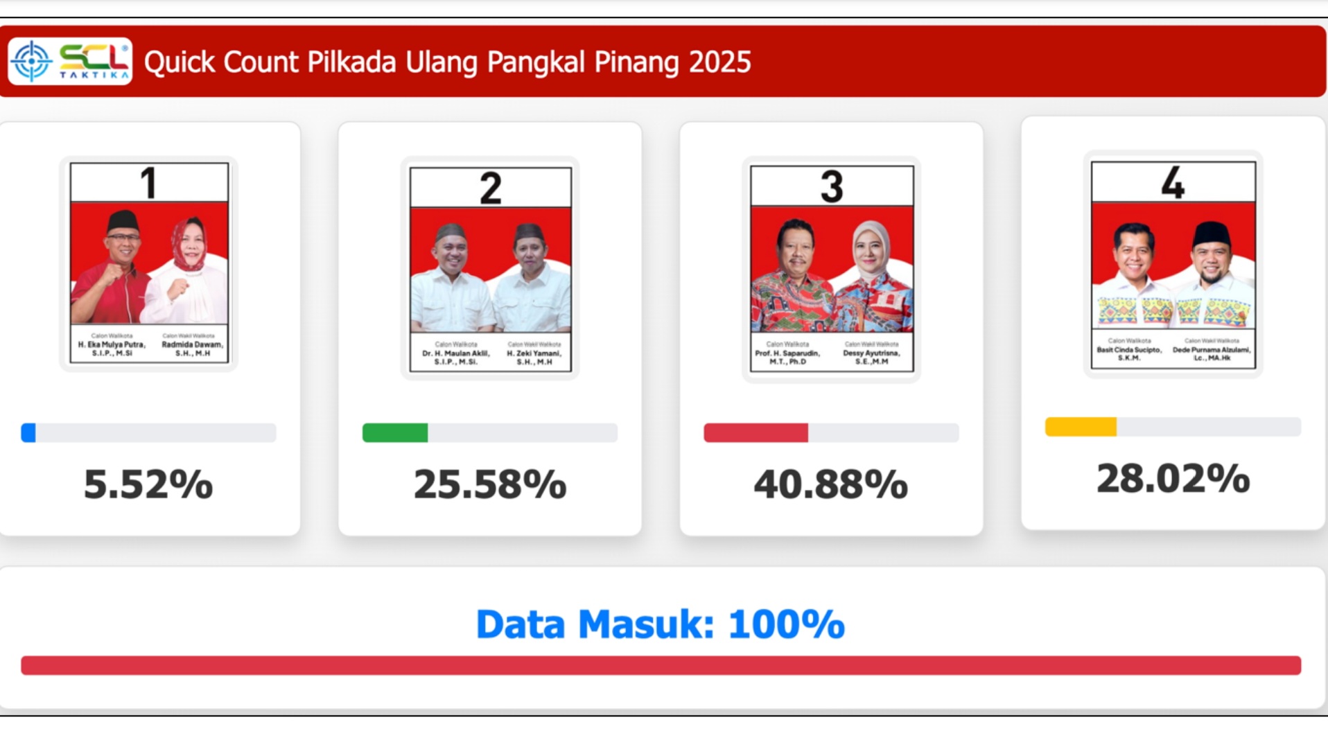 PANGKALPINANG, DAN – Pasangan calon Wali Kota dan Wakil Wali Kota Pangkalpinang nomor urut 03, Prof. Saparudin (Prof. Udin) – Dessy Ayutrisna, unggul dalam hitung cepat (quick count) Pemungutan Suara Ulang (PSU) Pilkada Pangkalpinang 2025 versi SCL Taktika Konsultan.