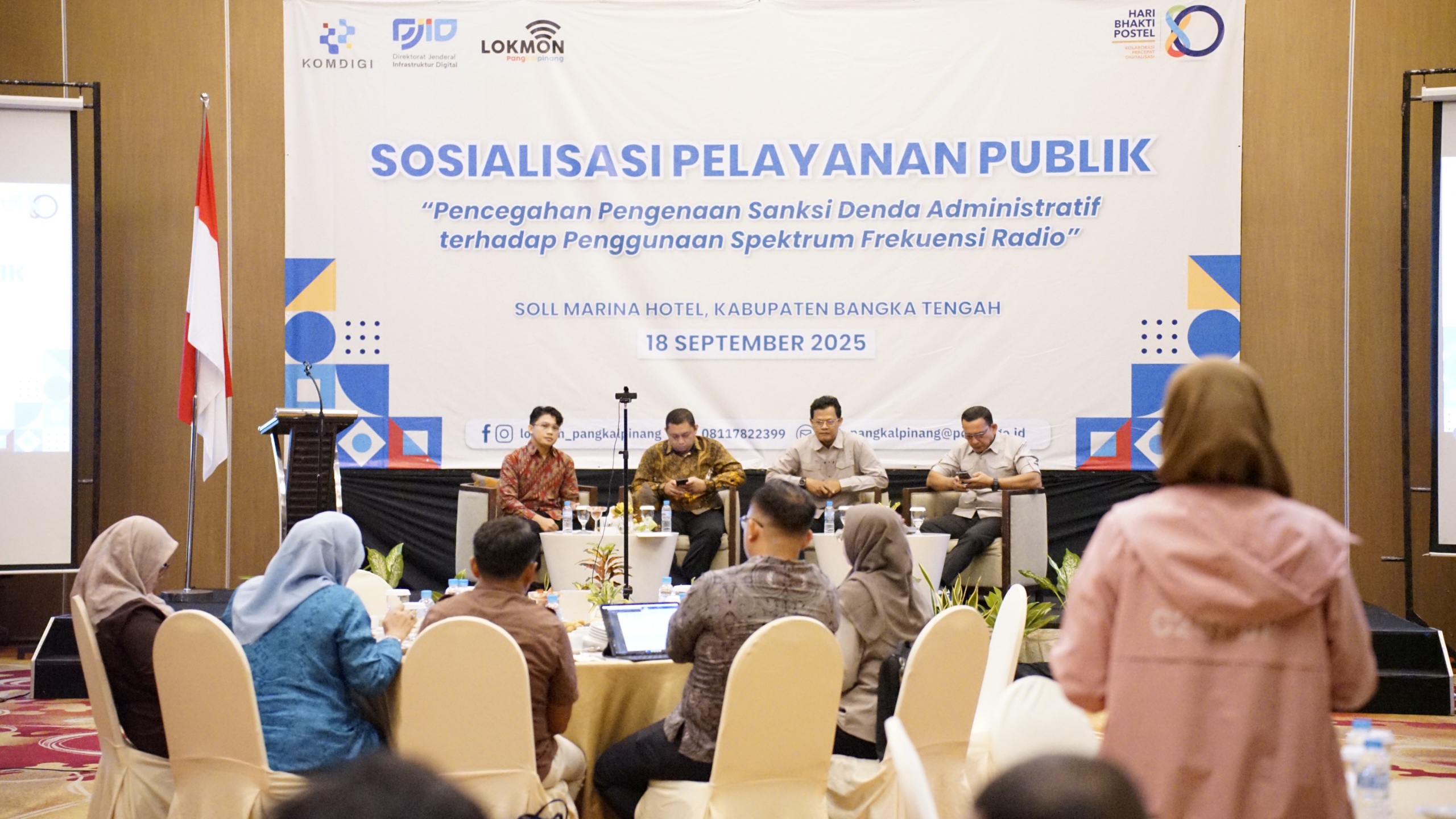 PANGKALPINANG, DAN – Loka Monitor Spektrum Frekuensi Radio (SFR) Pangkalpinang menggelar kegiatan Sosialisasi Pelayanan Publik dengan tema ‘Pencegahan Pengenaan Sanksi Denda Administratif terhadap Penggunaan Spektrum Frekuensi Radio’ di Ruang Soll Marina 1, Soll Marina Hotel & Conference Center, Bangka Tengah, Kamis (18/9/2025). Kegiatan ini digelar untuk meningkatkan pemahaman para pengguna frekuensi radio terhadap regulasi yang berlaku sekaligus mencegah potensi pelanggaran yang berakibat sanksi administratif.