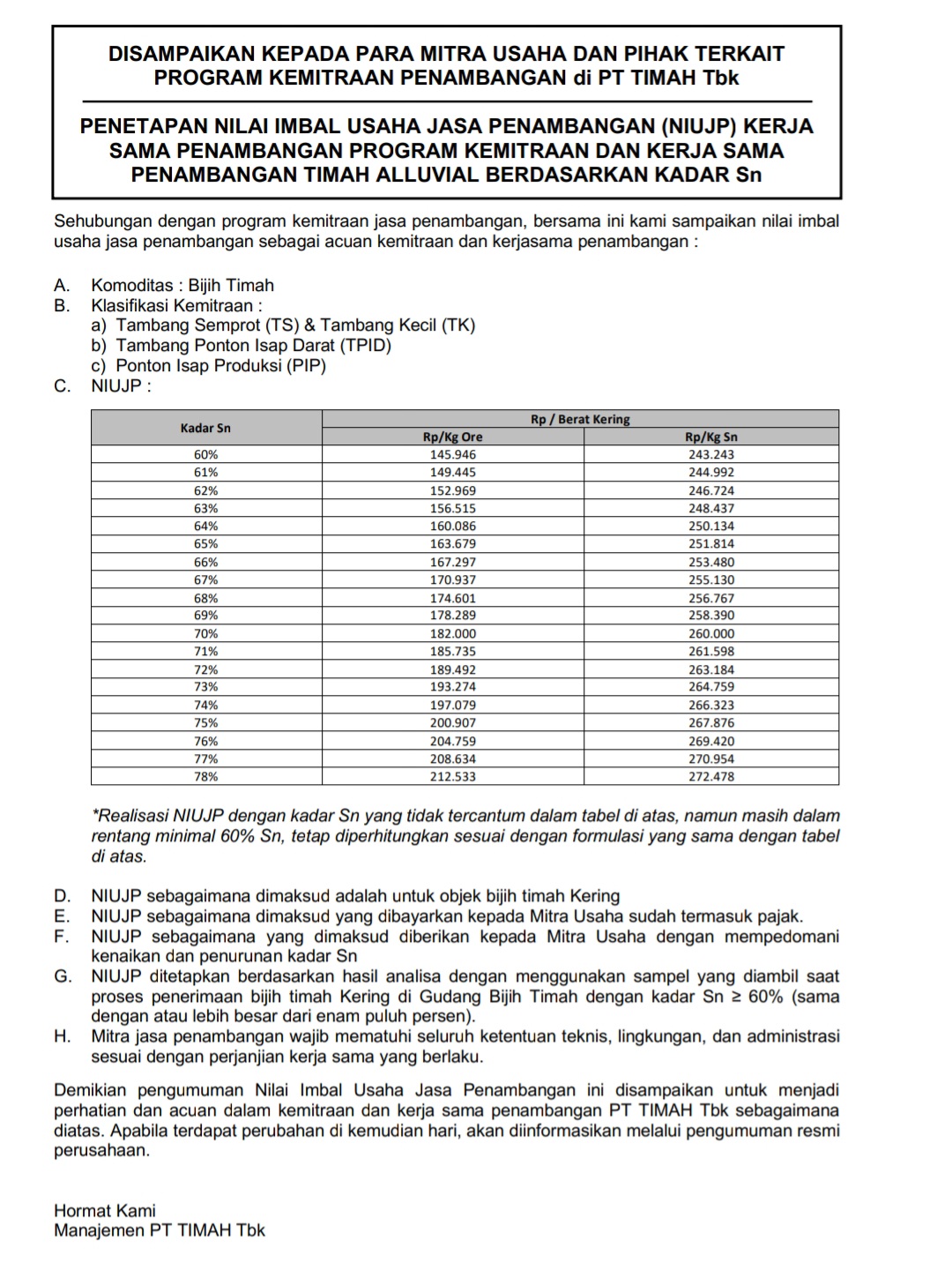 Dalam pengumuman tersebut, PT Timah Tbk menjelaskan bahwa penetapan NIUJP dihitung berdasarkan kadar timah (Sn) pada bijih timah kering, dengan batas minimal kadar sebesar 60 persen. Nilai imbal yang diberikan kepada mitra usaha berbeda sesuai dengan kadar Sn yang dihasilkan, dengan rincian mulai dari Rp145.946 per kilogram ore untuk kadar Sn 60 persen hingga Rp212.533 per kilogram ore untuk kadar Sn 78 persen.
