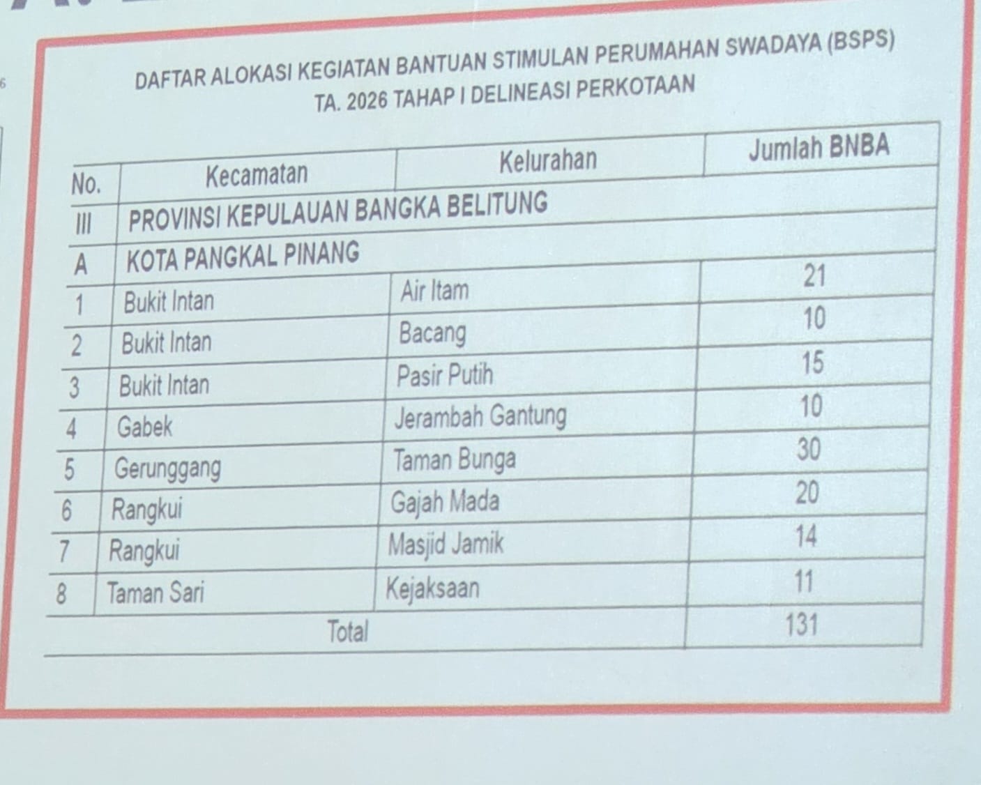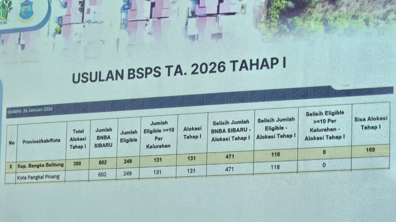 Berdasarkan data alokasi, Kota Pangkalpinang memperoleh 300 unit alokasi BSPS tahap I, dengan sisa alokasi sebanyak 169 unit yang masih harus digenjot agar memenuhi kriteria eligible.