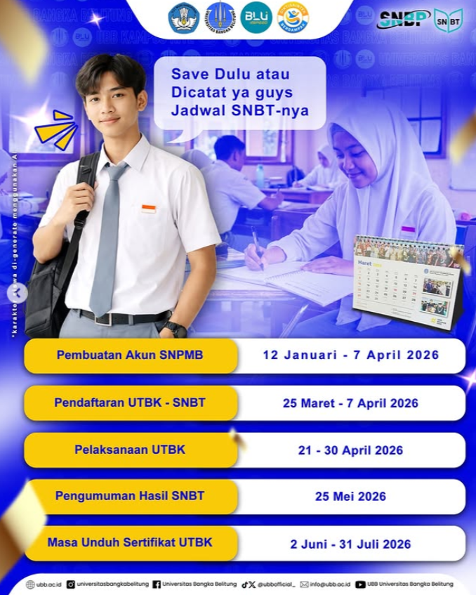 BANGKA, DAN – Universitas Bangka Belitung (UBB) mengingatkan para calon mahasiswa untuk mencatat jadwal penting UTBK-SNBT 2026. Pendaftaran seleksi masuk perguruan tinggi negeri melalui jalur tes ini akan mulai dibuka pada 25 Maret hingga 7 April 2026.