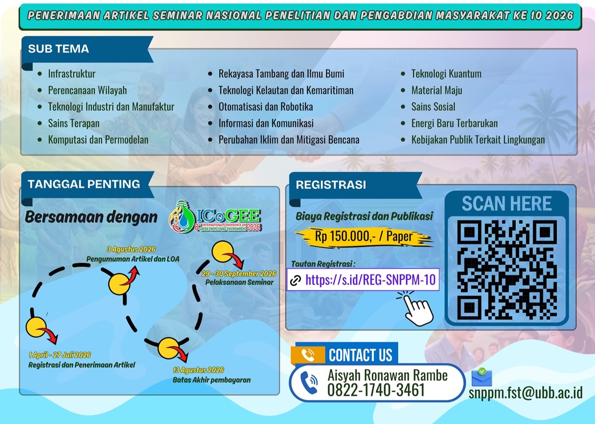 BANGKA, DAN – Fakultas Sains dan Teknik Universitas Bangka Belitung (UBB) resmi membuka call for paper untuk The 8th International Conference on Green Energy and Environment 2026 (ICoGEE 2026) sejak 1 April 2026. Kegiatan seminar internasional ini mengangkat tema “Accelerating Sustainable Energy and Innovation For An Environmentally Resilient Future” dan akan digelar secara daring pada 29–30 September 2026.